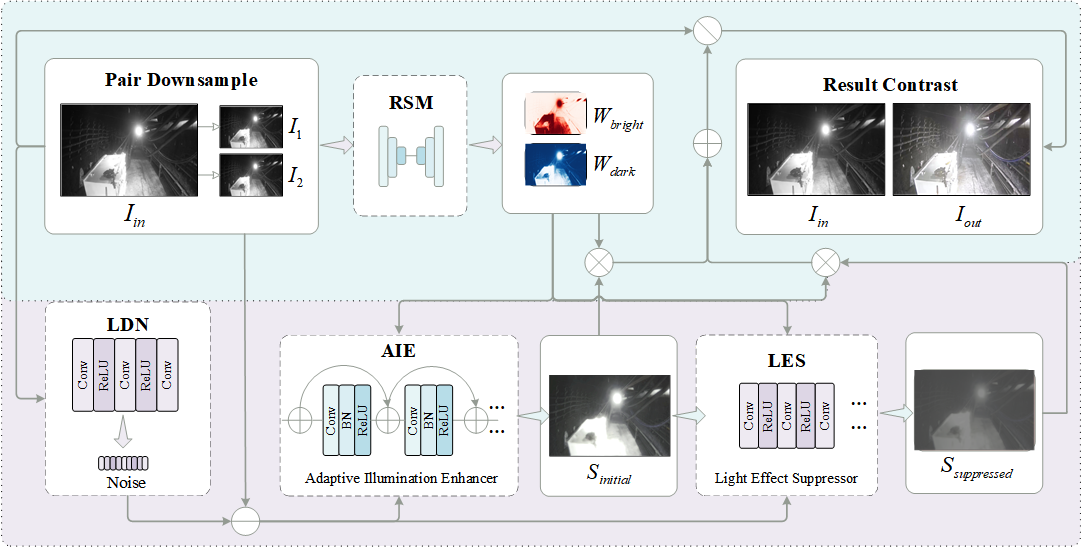 自适应照明增强模块(AIE) 对去噪后的特征进行暗区/亮区加权,分别通过共享残差块进行特征增强,再通过融合模块生成初始照明图 (S_{\text{initial}})。该过程重点提升暗区亮度,同时尽量保持亮区结构稳定。