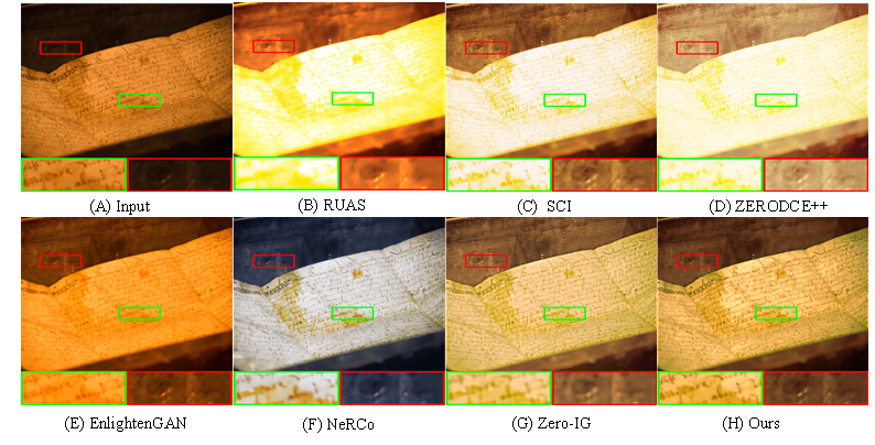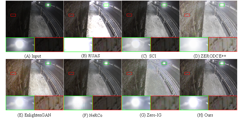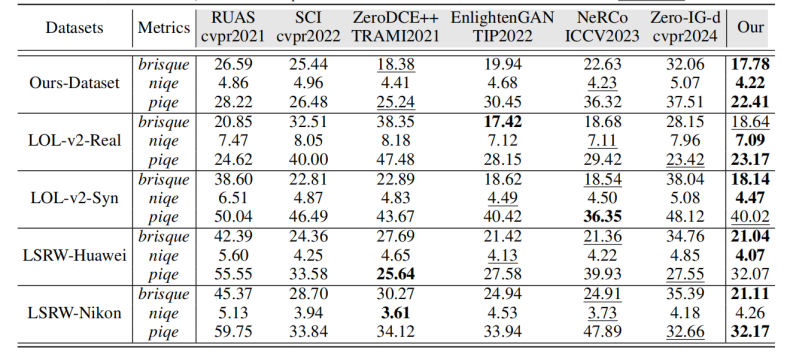 本文在 LOL-v2(Real 与 Synthetic)、LSRW(Huawei 与 Nikon)以及自建煤矿井下低照度数据集上进行了对比实验,基线方法包括 RUAS、SCI、ZeroDCE++、EnlightenGAN、NeRCo、Zero-IG 等代表性算法(missing reference)。