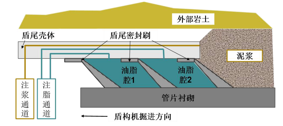 盾构法作为现代隧道工程施工的核心技术,广泛应用于城市轨道交通、跨江越海隧道等重大工程中。其核心设备盾构机在掘进过程中,盾尾密封系统起着至关重要的作用。如图1所示,该系统通过多道密封刷、注脂通道和注浆通道等结构,结合密封油脂的润滑与密封功能,隔绝外部高压土水环境与盾体内部安全空间,防止地下水、泥浆等流体侵入,保障施工安全。