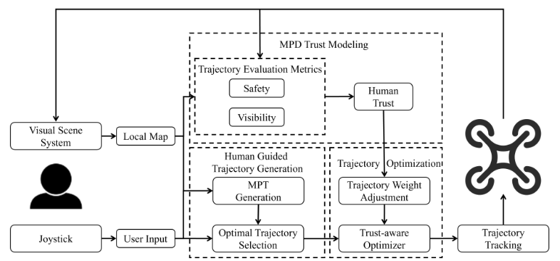 从现有研究来看,一方面,面向辅助空中遥操作的人机信任建模工作仍然相对薄弱,已有模型多针对地面机器人或自动驾驶场景构建,尚未充分考虑空域环境复杂性与遥操作感知受限等特点,难以直接迁移应用。另一方面,即便获得了合适的信任模型,如何将这种随时间变化的信任信息真正“落地”到无人机的规划与控制之中,使其能够根据操作者的实时信任水平自适应调整自主性与干预程度,也缺乏系统性的框架与方法。目前大多数辅助规划仅关注意图预测与轨迹生成,对信任这一关键人因变量缺乏显式建模与融合机制。