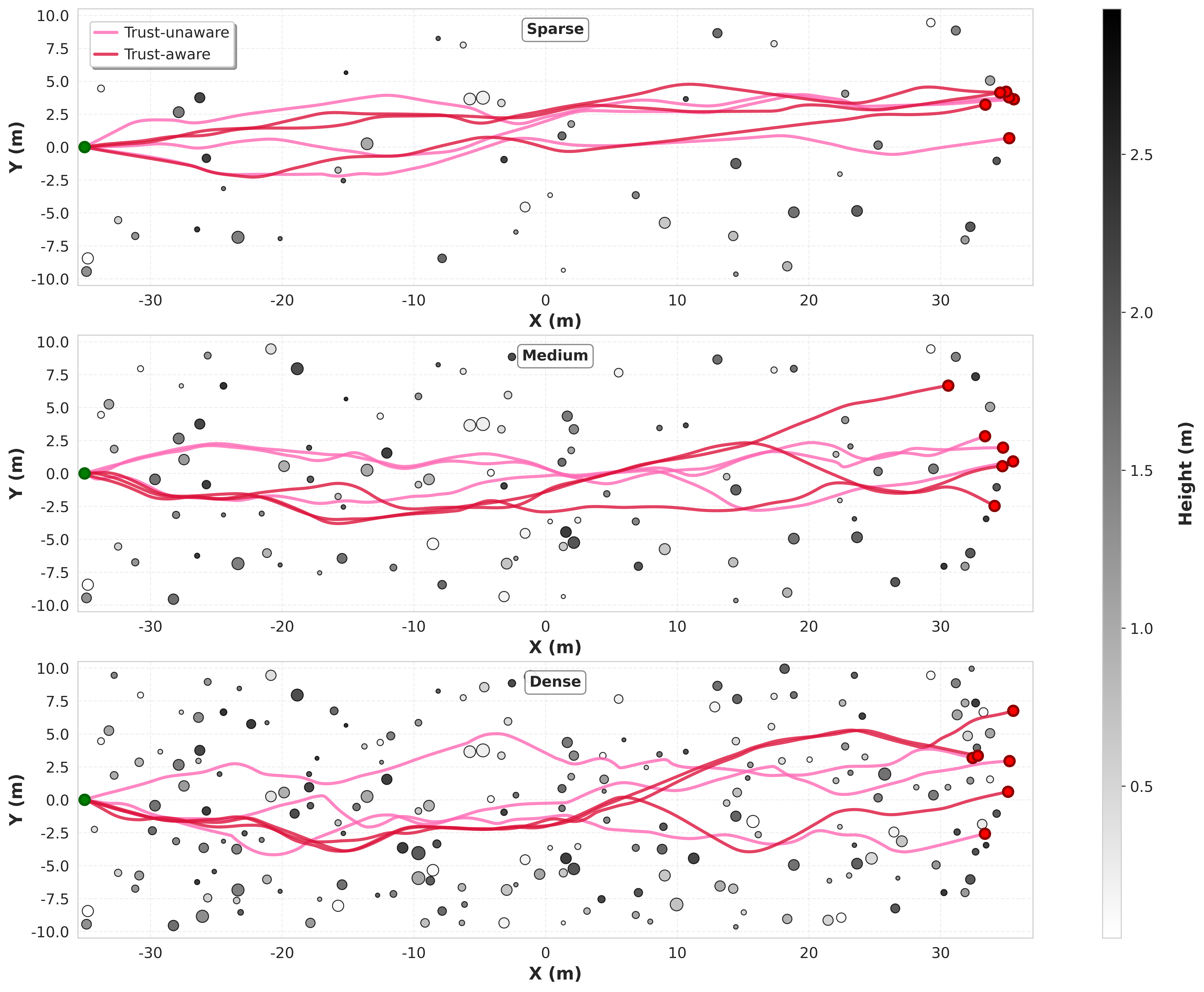 本文在三种不同树木密度(稀疏、中等、稠密)的随机森林仿真环境中,对比了所提出的信任感知轨迹规划方法与不考虑信任的基线方法在人–无人机协同任务中的性能。两种方法均采用相同的实验平台和任务设置:操作者通过摇杆输入指令,引导四旋翼从森林一端飞行至另一端,系统记录任务距离、时间、平均速度以及人机交互相关指标。无人机飞行轨迹如下图所示:
